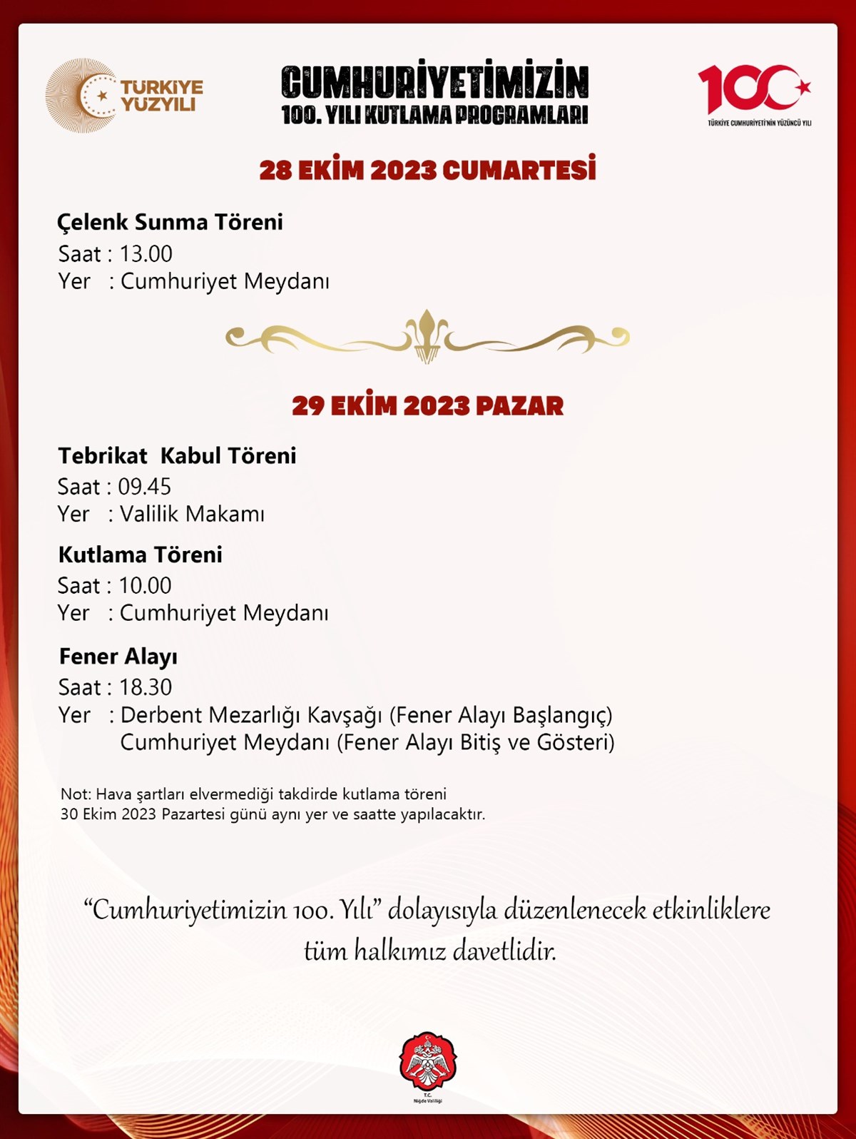 29 Ekim Pazar günü saat 18.30’da Gençlik Spor İl Müdürlüğü ve Niğde Belediye Başkanlığı’nca organize edilen Derbent Mezarlığı Kavşağından başlayıp Cumhuriyet meydanında son bulacak olan Fener Alayı, Recep Tayyip Erdoğan Anadolu İmam Hatip Lisesi Boru Trampet Takımı ile İl Jandarma Asayiş Komando Bölük Komutanlığı personeli eşliğinde icra edilecektir.